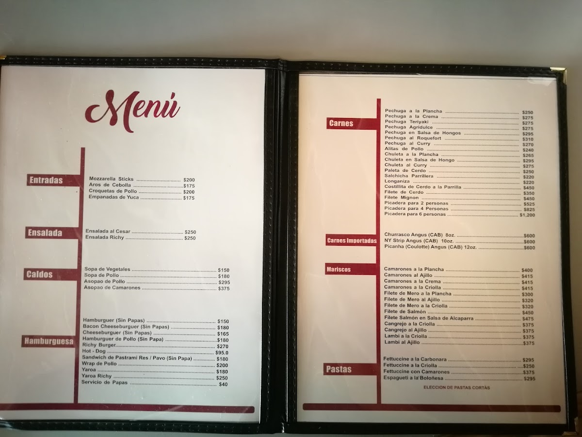 The menu at Donde Richy reflects a clear focus on comforting flavors and approachable variety, making it easy to see why it appeals to both locals and visitors. The drink selection sets a relaxed tone, with the Piña Colada delivering a smooth, tropical balance and the Jugo de Uva Efervescente offering a refreshing, lightly sparkling alternative that works well alongside the food. On the savory side, the Filete de Cerdo stands out for its hearty portion and satisfying preparation, while the Pechuga de Pollo En Salsa de Crema Con Tostones highlights a comforting combination of tender chicken, creamy sauce, and crispy tostones that feels both filling and well thought out. For those looking for something more casual, the Richy Burguer adds a familiar, indulgent option that rounds out the menu nicely. Overall, the menu feels cohesive and balanced, mixing traditional flavors with simple crowd-pleasers, and leaving a strong impression of a restaurant that understands its identity and delivers consistently across its featured dishes.